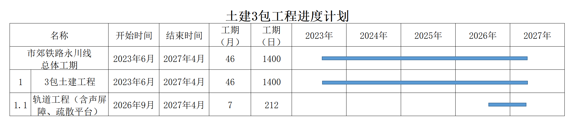 本施工總承包土建工程施工工期46個月。第40個月開始鋪軌工作,鋪軌施工工期7個月;第40個月開始本施工總承包無條件為站后工程提供施工場地和施工條件。