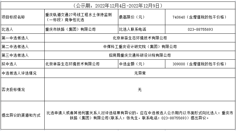 重慶軌道交通27號(hào)線工程水土保持監(jiān)測(cè)(一標(biāo)段)競(jìng)爭(zhēng)性比選結(jié)果公示表