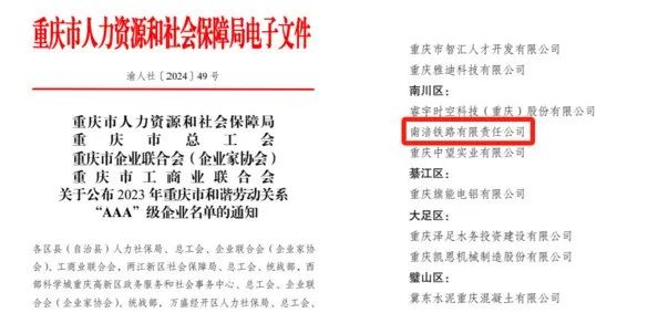 近日,重慶市人力資源和社會(huì)保障局、重慶市總工會(huì)、重慶市企業(yè)聯(lián)合會(huì)(企業(yè)家協(xié)會(huì))、重慶市工商業(yè)聯(lián)合會(huì)發(fā)布了《關(guān)于公布2023年重慶市和諧勞動(dòng)關(guān)系“AAA”級(jí)企業(yè)名單的通知》(渝人社〔2024〕49 號(hào)),表彰了一批有力維護(hù)和諧勞動(dòng)關(guān)系、切實(shí)保障職工權(quán)益的優(yōu)秀企業(yè),市鐵路集團(tuán)南涪鐵路公司榜上有名。