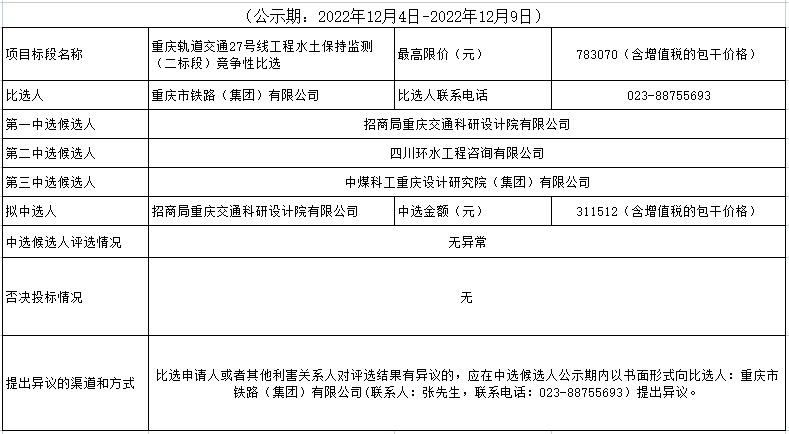 重慶軌道交通27號(hào)線工程水土保持監(jiān)測(cè)(二標(biāo)段)競(jìng)爭(zhēng)性比選結(jié)果公示表