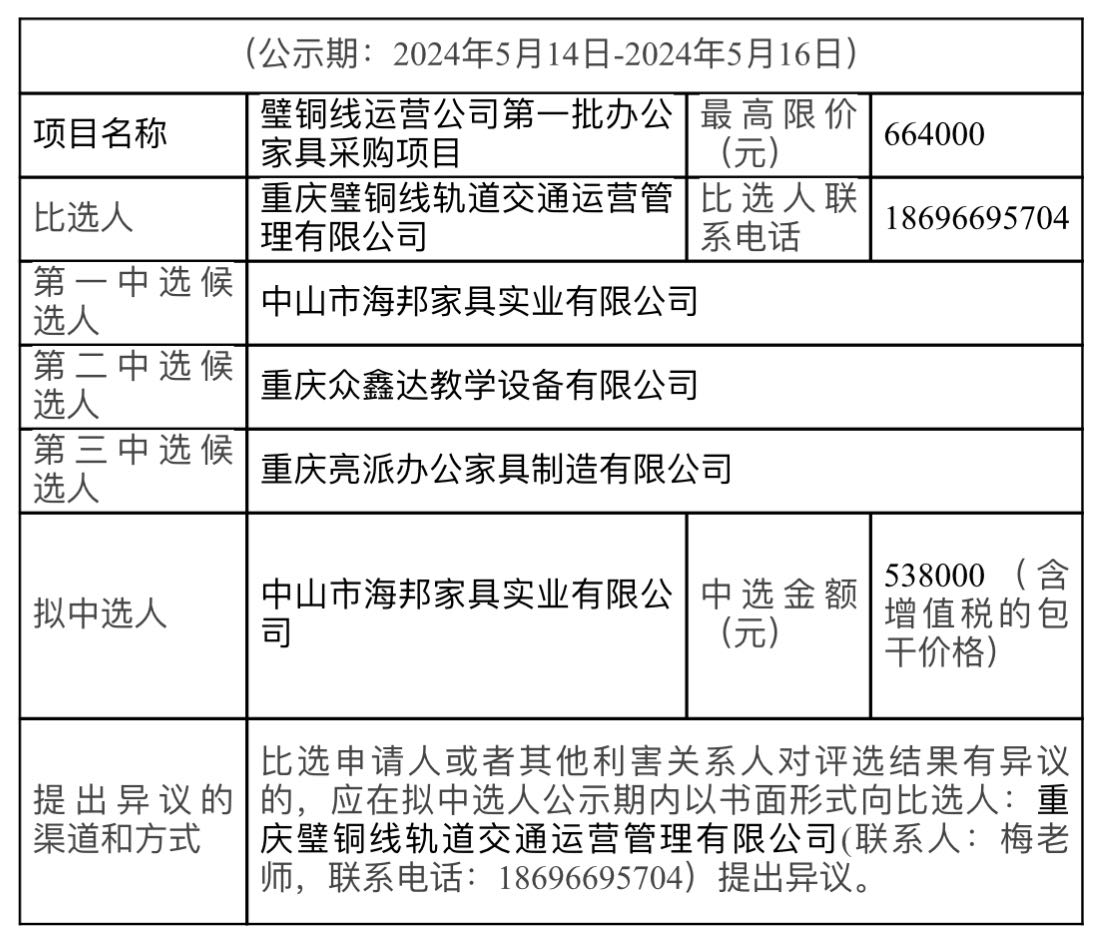 璧銅線運營公司第一批辦公家具采購項目競爭性比選結(jié)果公示表