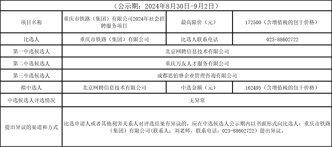 重慶市鐵路(集團(tuán))有限公司2024年社會招聘服務(wù)項(xiàng)目競爭性比選結(jié)果公示表