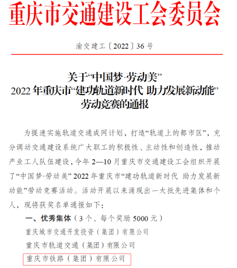 近日,重慶市交通建設(shè)工會對“建功軌道新時代 助力發(fā)展新動能”勞動競賽的優(yōu)秀集體、班組和個人進(jìn)行了表彰,市鐵路集團(tuán)榮獲“優(yōu)秀集體”,城軌快線15號線項(xiàng)目部、27號線項(xiàng)目部獲“優(yōu)秀班組”,6人分別獲得“優(yōu)秀個人”“優(yōu)秀組織獎(個人)”。