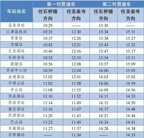貫通運(yùn)營(yíng)終點(diǎn)站:受前期軌道交通5號(hào)線中段(忠恕沱站、紅巖村站、歇臺(tái)子站)建設(shè)調(diào)試影響,目前貫通列車暫未進(jìn)行5號(hào)線中段及北段調(diào)試工作,不具備開行至5號(hào)線中段、北段的條件,因此,現(xiàn)階段貫通列車終點(diǎn)站為石橋鋪站。有到后續(xù)站點(diǎn)的乘客需在石橋鋪站換乘其它線路列車。